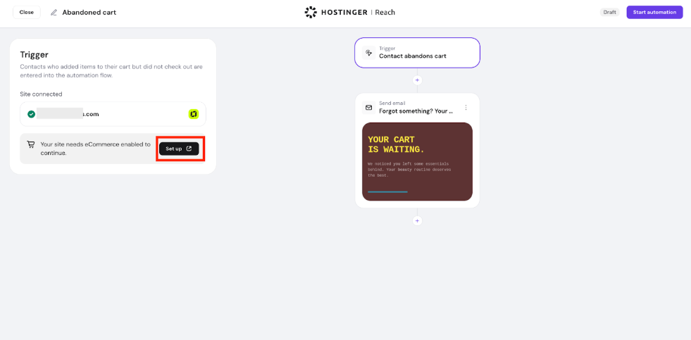 - The trigger is preconfigured — no adjustments needed. If you don’t have a site connected or it does not contain a eCommerce, you will be guided to set it up.