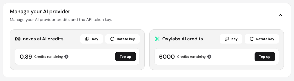 If your project utilizes nexos.ai or Oxylabs credits, additional management options appear below the project list: