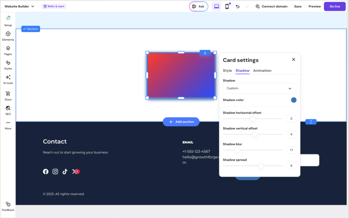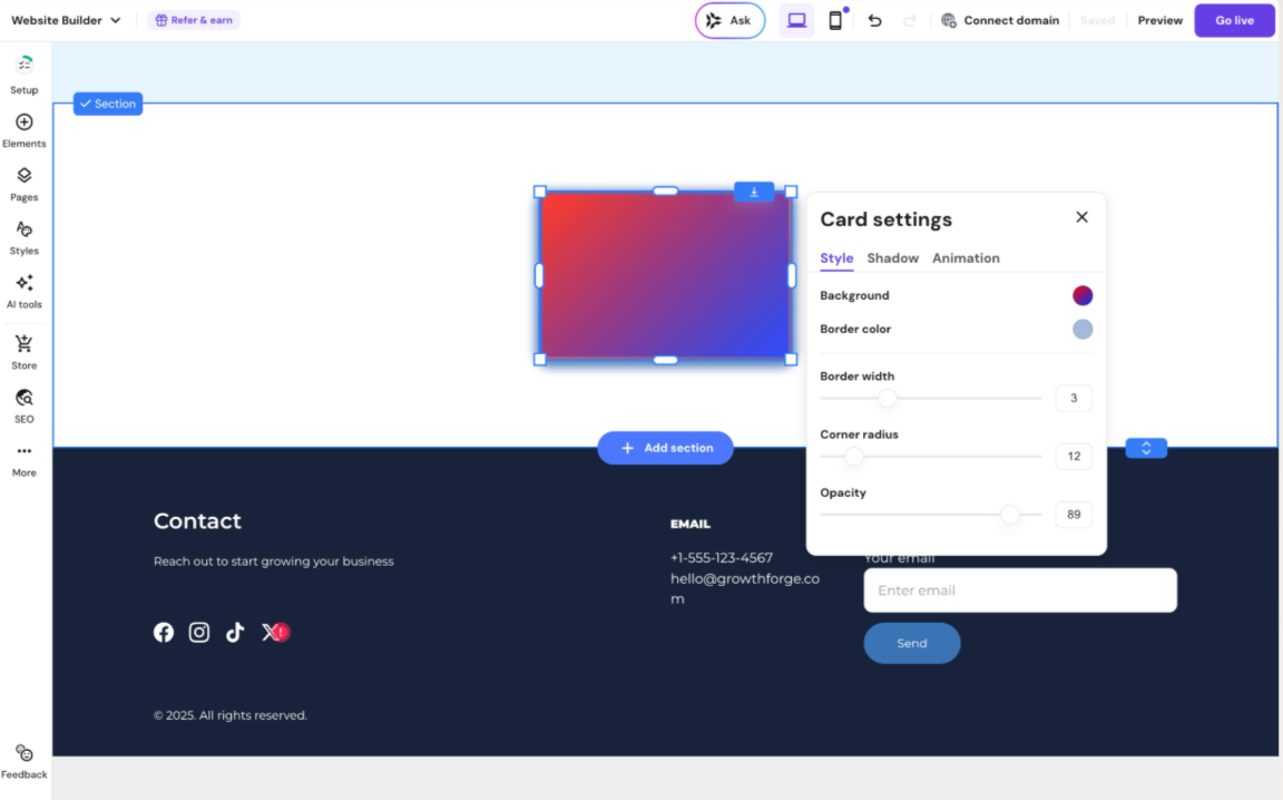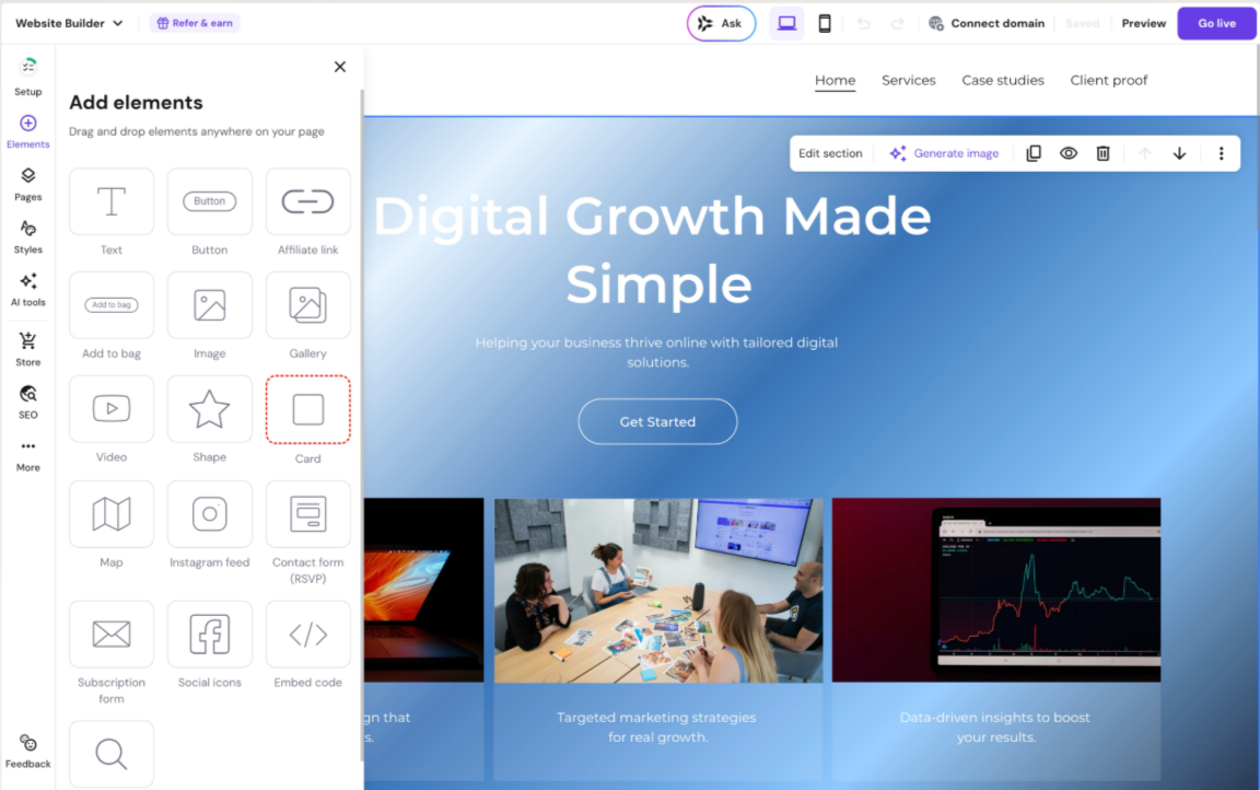 The Card element in Hostinger Website Builder lets you create modern, styled container layouts for your website. It supports borders, background fills, and shadows, giving you full control over how your content is structured and presented.