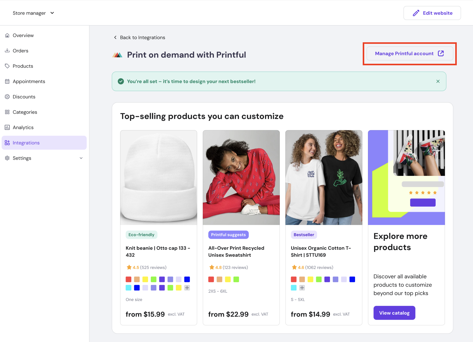 - Pick any product from the Printful catalog and customize it with your design, just like you would for your store