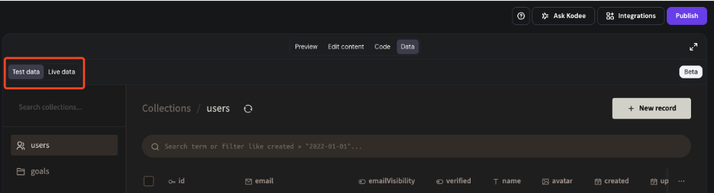 On the left panel when ‘Data’ is toggled , you’ll find your Collections — groups of records such as contacts, posts, or users.