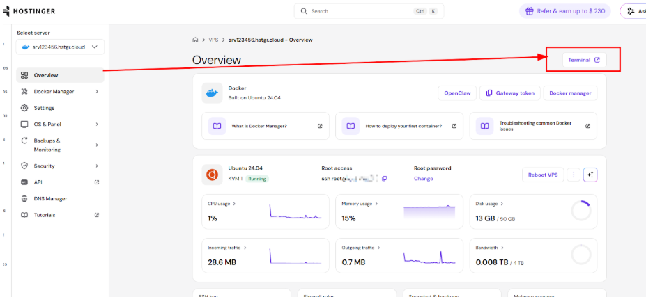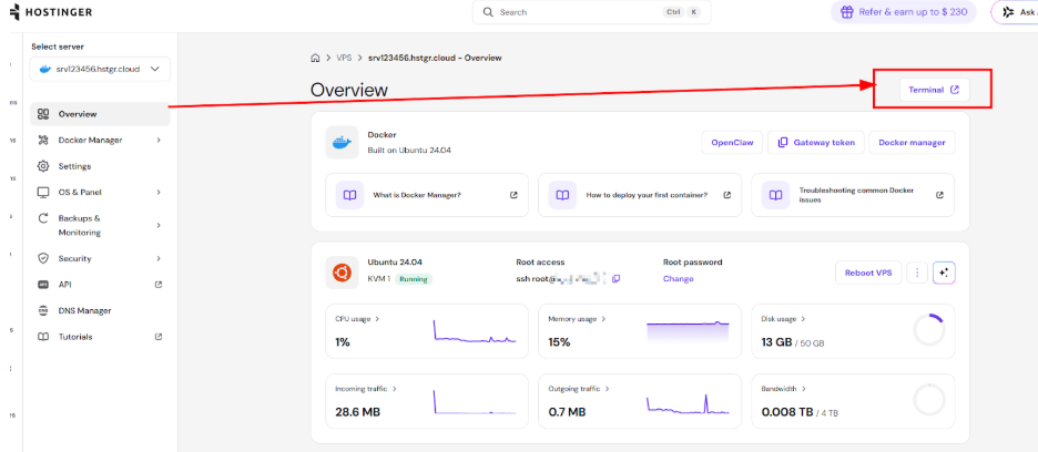 Access your VPS via SSH or use Browser terminal in hPanel.