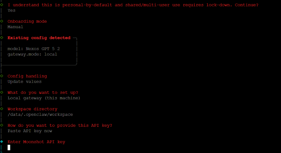 openclaw onboard --auth-choice moonshot-api-keyFollow the prompts to enter your Moonshot API key.