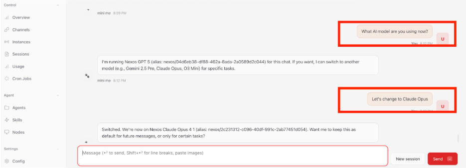 You can modify the AI model used by your OpenClaw instance either through a direct chat command or by manually updating your API provider settings in hPanel. With 1-Click OpenClaw, you can use only nexos.ai, OpenAI, Anthropic, or xAI. You can pick different models within nexos.ai.