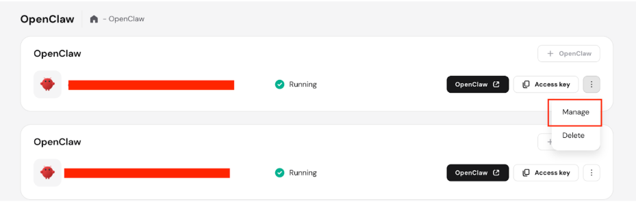 - Click the Options (⋮) button next to your instance and select Manage.