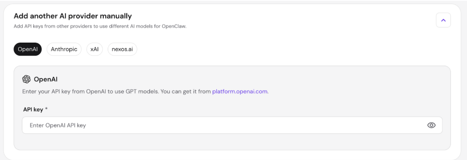 - Enter the API key obtained from your chosen vendor (e.g., OpenAI, Anthropic, xAI, or nexos.ai).