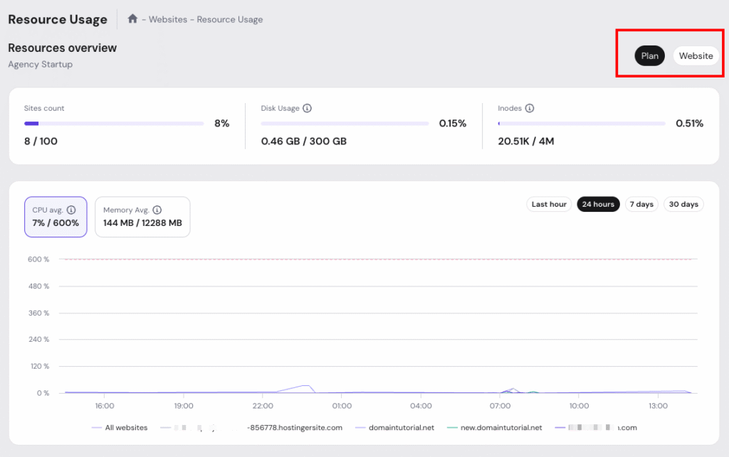 Go to Websites → Dashboard → Resources Usage. The data will be shown per hosting plan by default; to display per website, click on the Website button next to Resources overview.