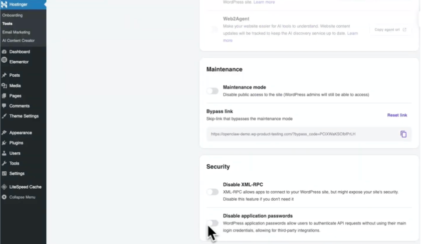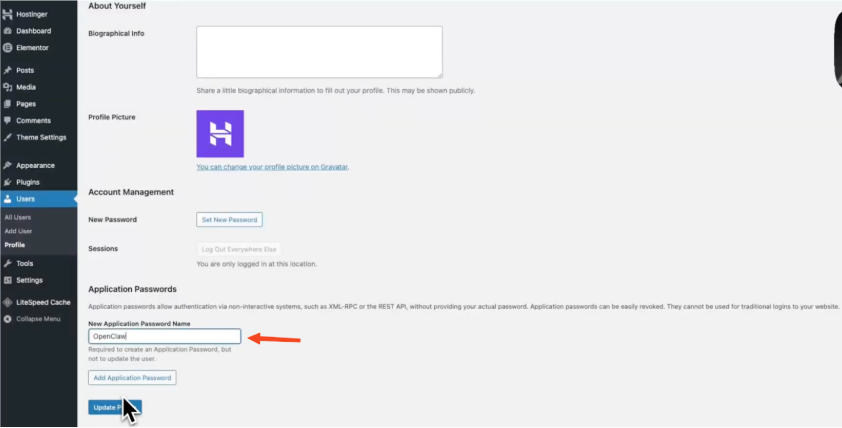 OpenClaw interacts with your site using the WordPress REST API and application passwords. For this, you’ll need your username and the application password.