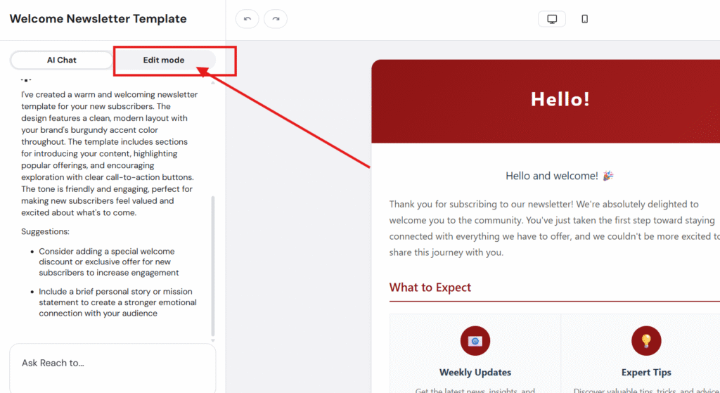 Navigate to Edit email template → Edit mode.