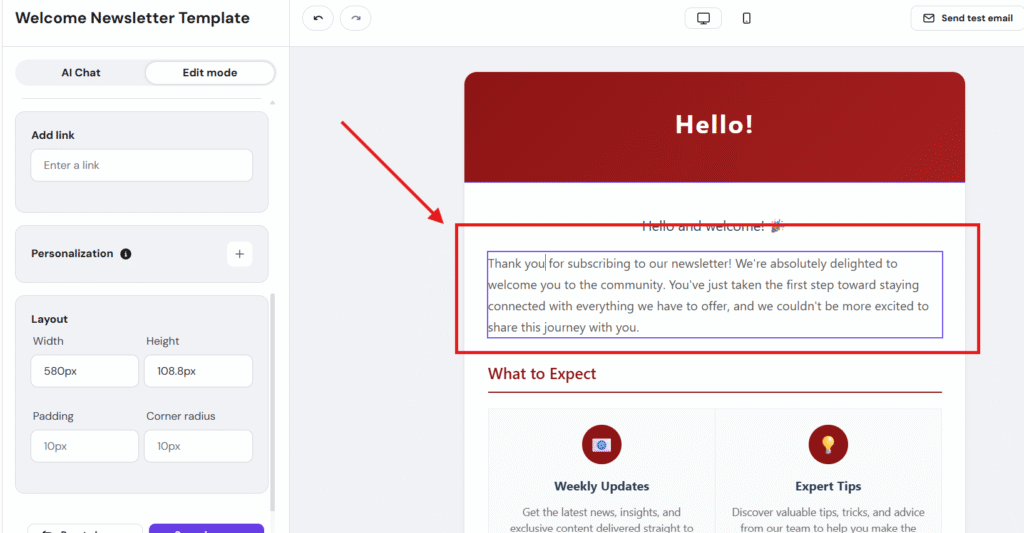 - You’ll see text in your template that looks like {{name, There}}. Do not delete or modify this placeholder, as it’s essential for personalization to work correctly.