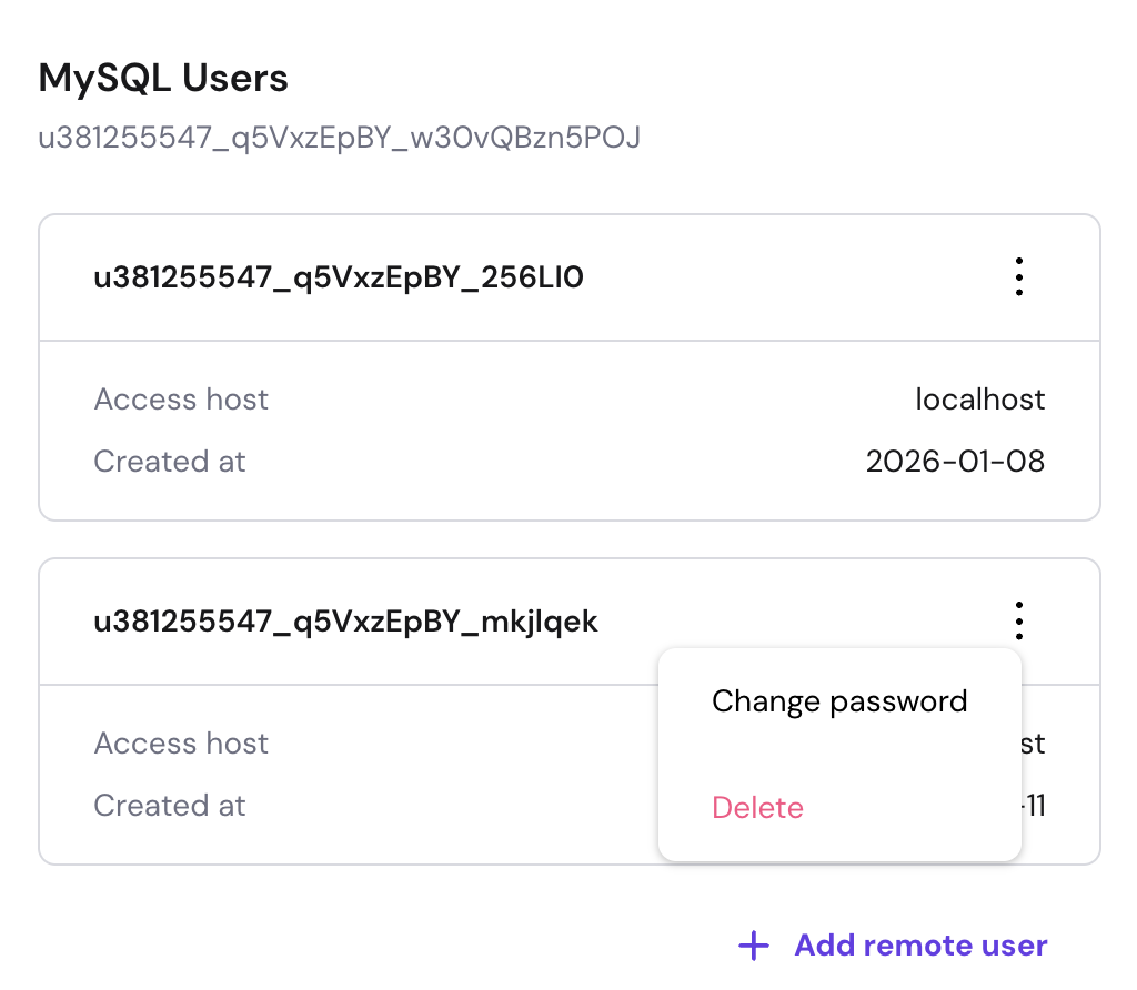 The Remote MySQL feature access allows remote hosts (servers) to manage your databases. To set it up, first, you need to allow the desired remote IP to connect to your database.