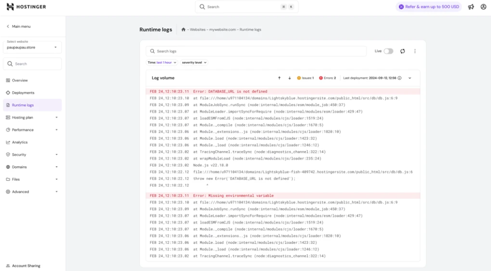 In Hostinger’s Node.js dashboard, runtime logs provide a centralized place to review these messages and quickly troubleshoot issues.