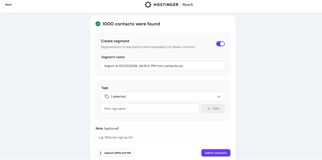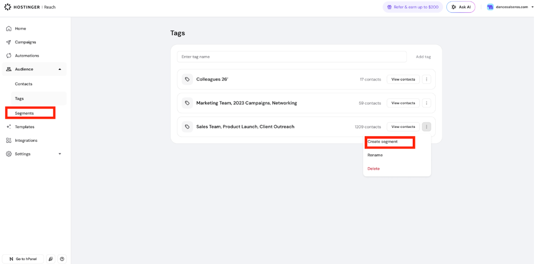Tags in Hostinger Reach help you organize your contacts and make audience segmentation more flexible and powerful. By assigning tags to contacts, you can later use them to build targeted segments and send more relevant campaigns.