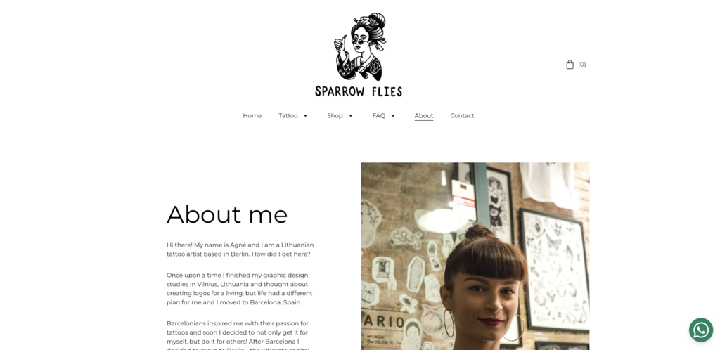 The About page of Sparrow Flies Tattoo exemplifies the key principles of an effective About Me page. It is clear and concise, providing a brief overview of the her journey from studying graphic design to becoming a tattoo artist. There’s no industry jargon, making it easy for anyone to understand.
