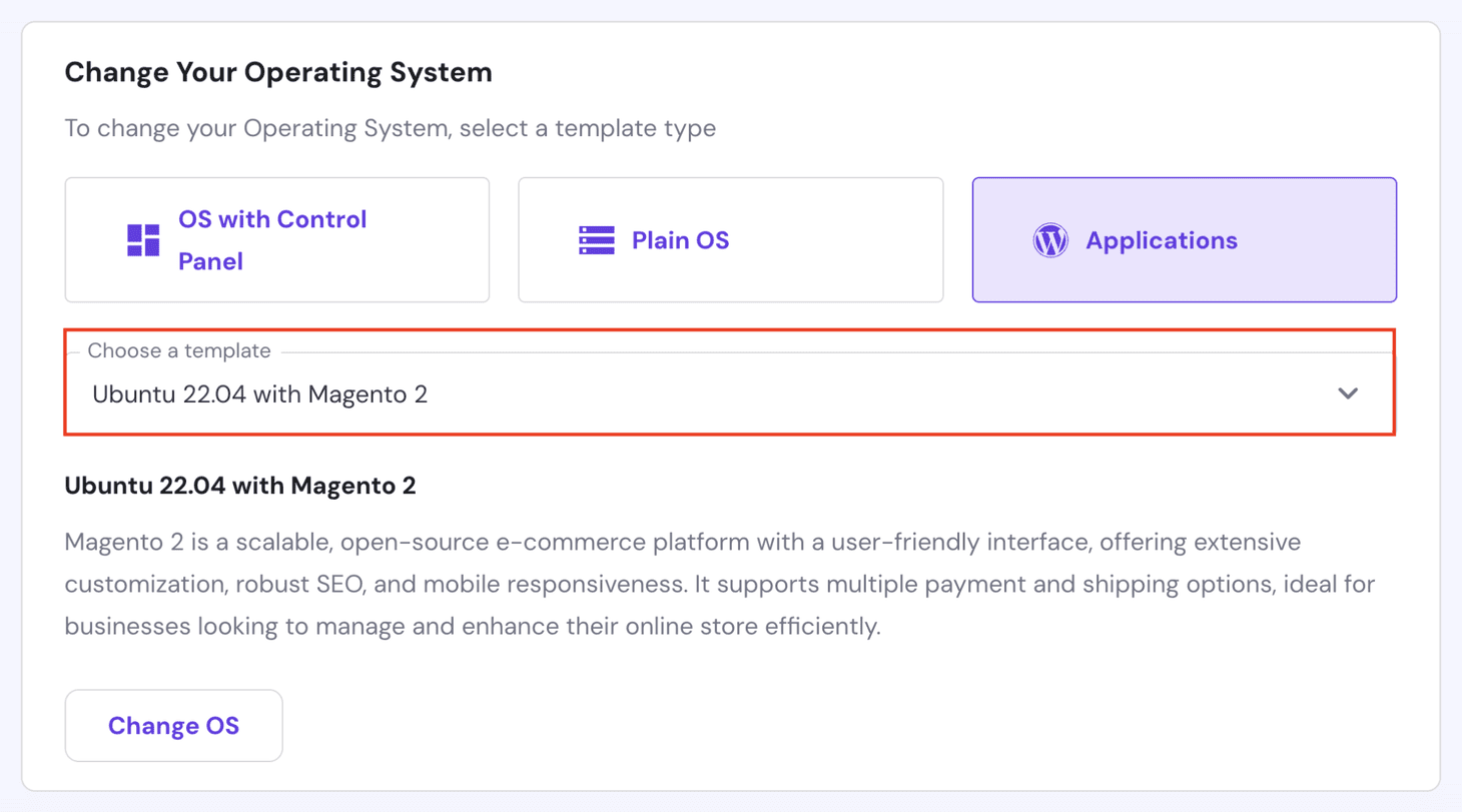 With Hostinger’s Magento hosting, you can use our VPS template to install Magento automatically. Just log in to your Hostinger account, go to VPS, and change your Operating System.