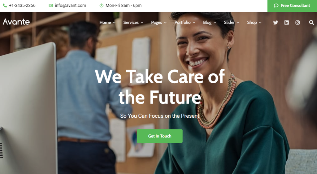 Avante is a premium theme with a professional look, suitable for corporate and consulting businesses. It comes with over 50 custom page templates to help start your website quickly.