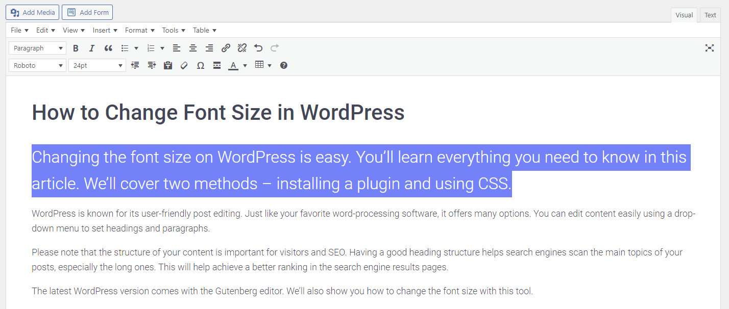 However, when using a plugin or the default WordPress editor, you need to do the change for every posts and page. Using CSS changes the font size for the whole site.