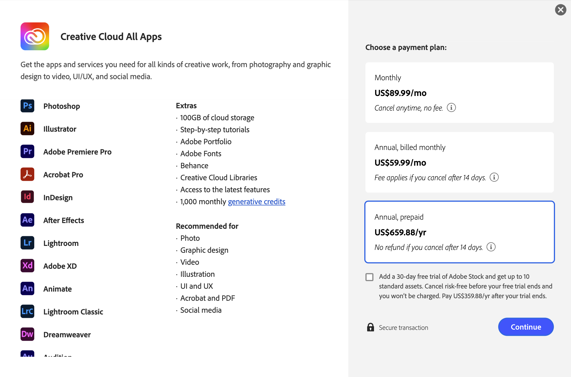 And the all-apps option that includes the entire collection of 20+ creative software including Photoshop, Illustrator, Premiere Pro, Acrobat Pro, InDesign and more will cost you $659.88 a year.