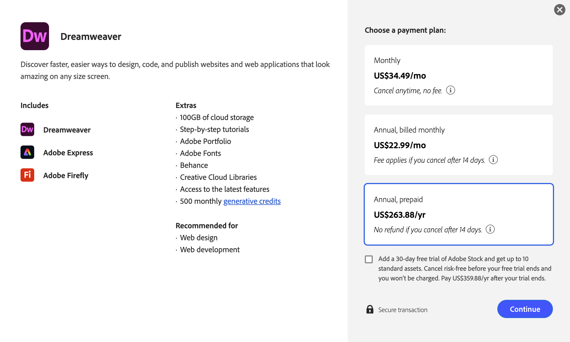 As a subscription-based software, Dreamweaver offers a range of plans for the individual user. The prepaid plan for the single app plus 100 GB of cloud storage, Adobe Portfolio, Express, Firefly, Fonts and more costs $263.88 annually.