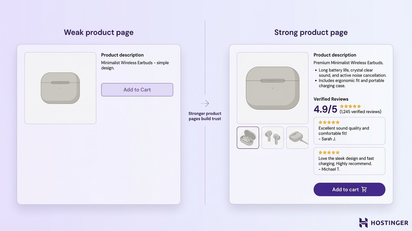 Trust comes first. If your store looks unfamiliar or risky, visitors hesitate. Reviews, secure payment badges, return information, and clear contact details reassure people that the purchase is safe.