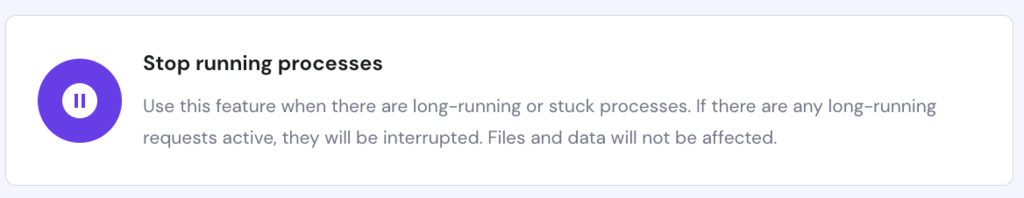 - If either NPROC or Entry Processes hit the limit, scroll down to find the Stop running processes option and click Stop. However, this is only a temporary solution. You still need to find the root cause by disabling certain plugins and reducing the number of running cron jobs.