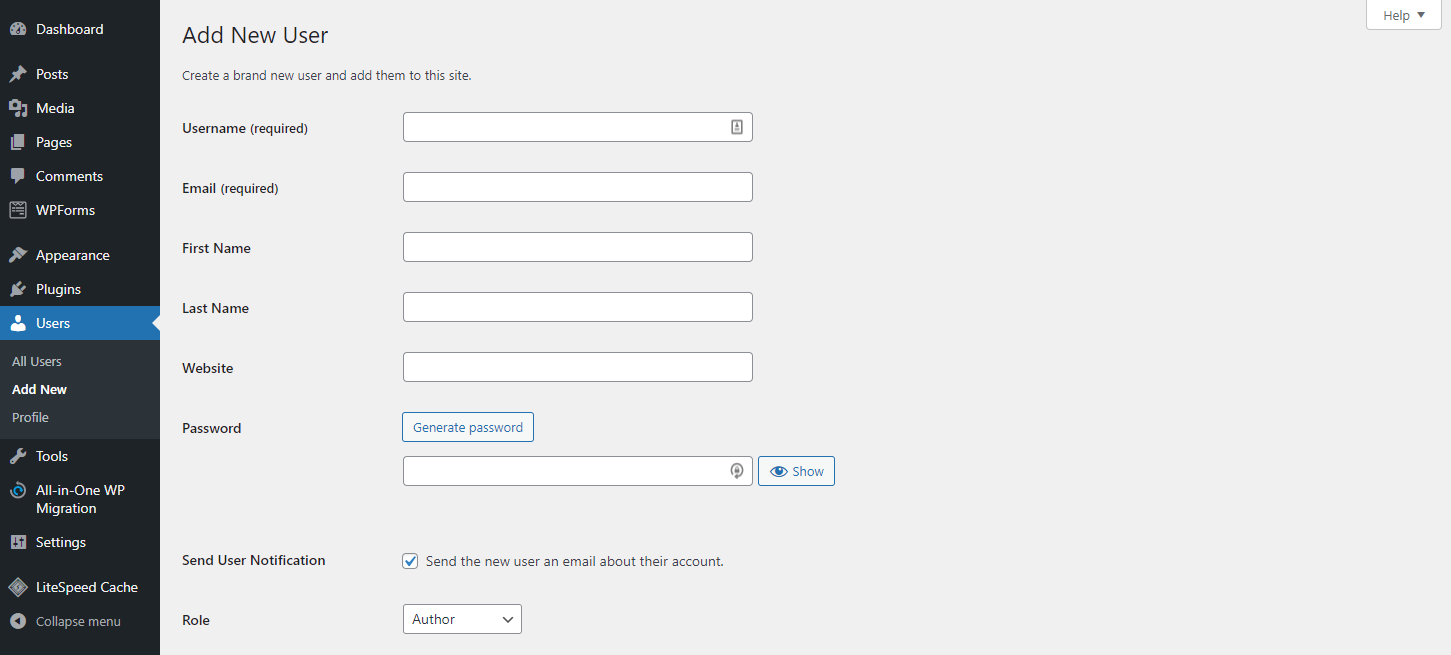 To assign different authors, add more WordPress user roles first. Head to the Dashboard → Users → Add New. Fill out the username and email address, then change the role to Author.