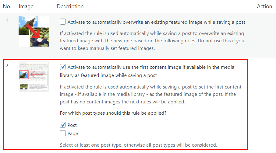 There are two default rules to choose from. We recommend activating the second rule, which assigns the first photo in the post or page as its featured image.