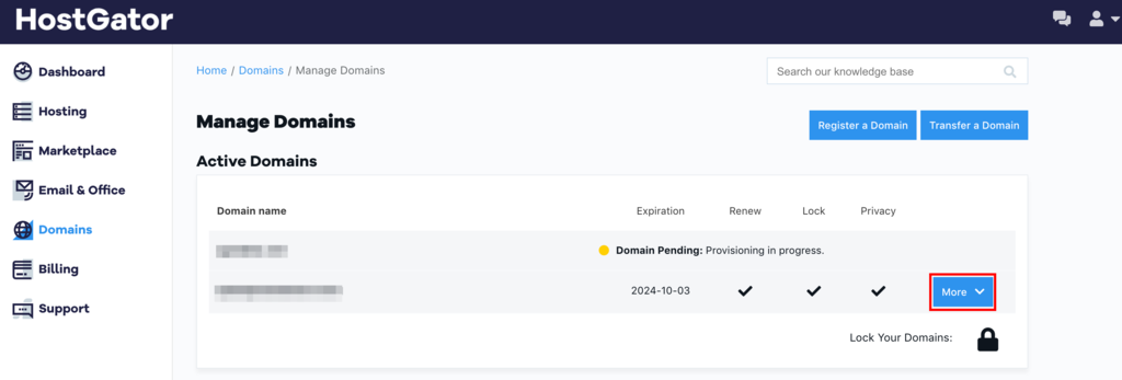 If you have multiple active domain names, select the More option next to the one you want to transfer.