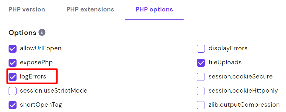 2. In the PHP options tab, tick the logErrors checkbox.