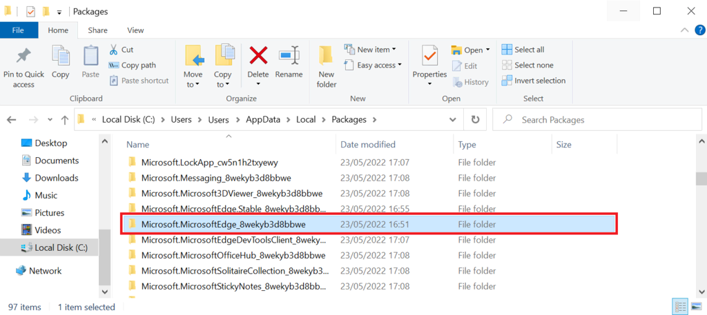 3. Find and delete the Microsoft.MicrosoftEdge_8wekyb3d8bbwe folder.