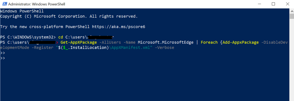 Get-AppXPackage -AllUsers -Name Microsoft.MicrosoftEdge | Foreach {Add-AppxPackage -DisableDevelopmentMode -Register “$($_.InstallLocation)\AppXManifest.xml” -Verbose}