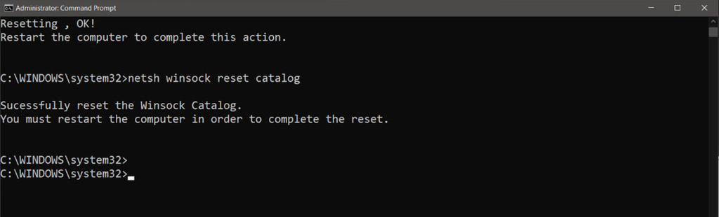 Resetting system’s Winsock catalog via Command Prompt