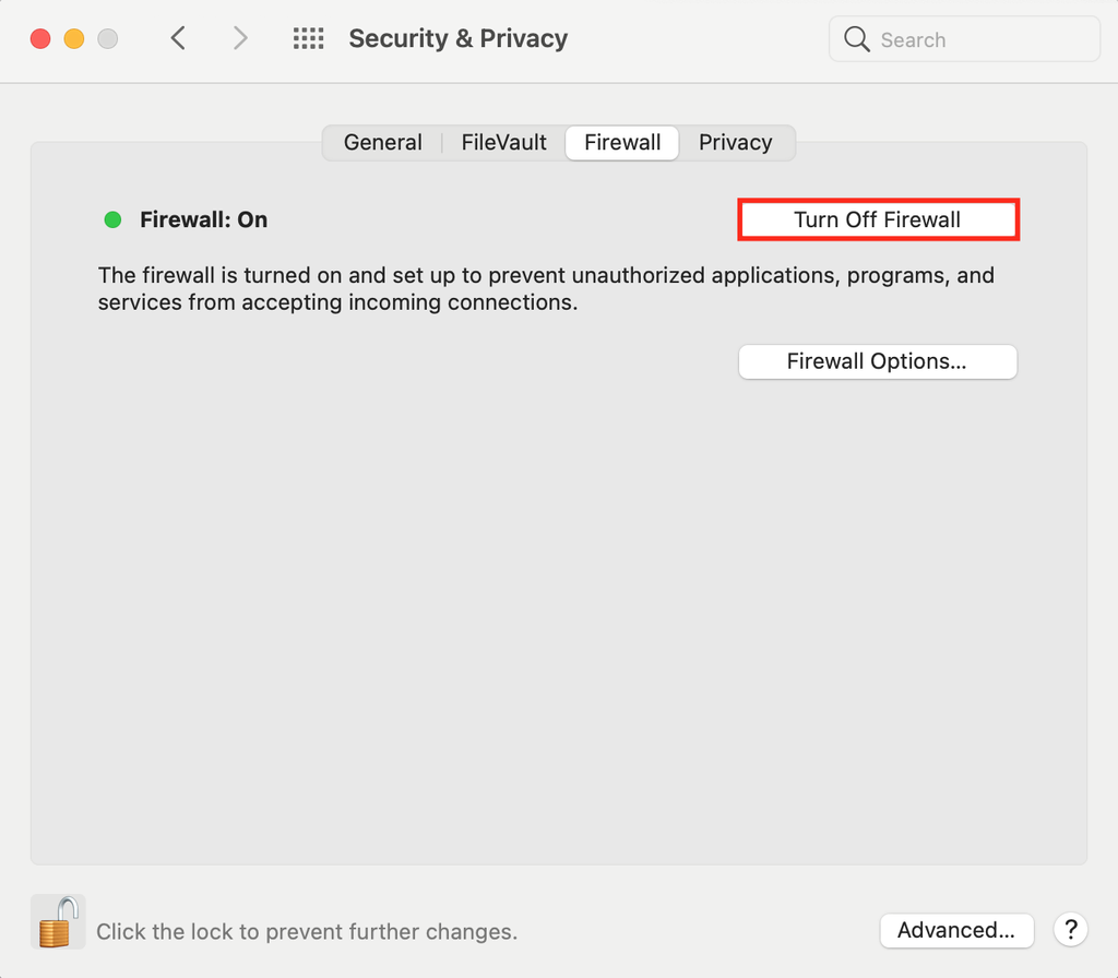 Note that the steps to disable the firewall on Mac might be slightly different depending on your macOS version.
