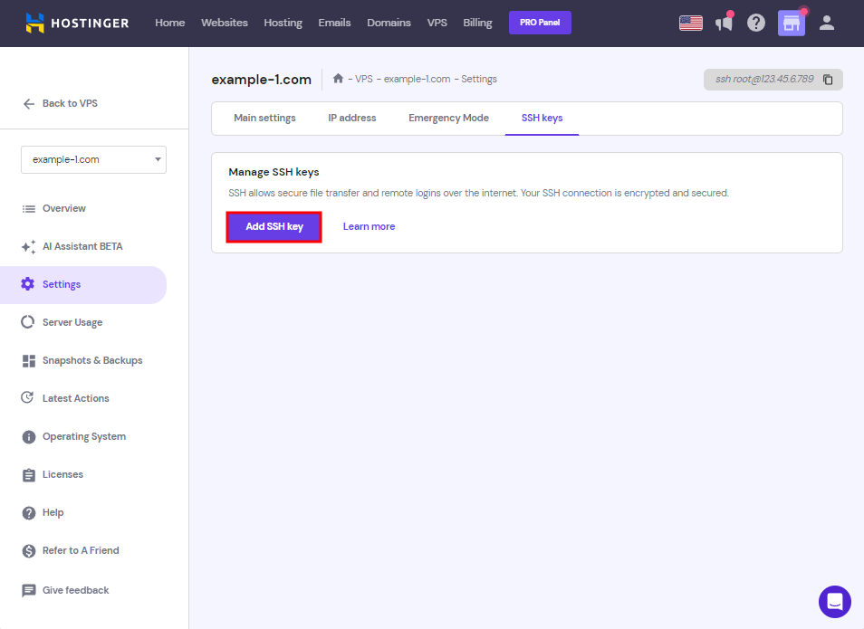 If you’re a Hostinger VPS user, our hPanel provides a one-click button to copy your public key to your server’s SSH.
