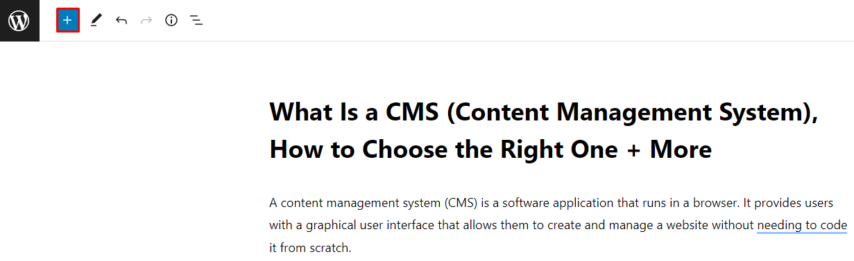 - Click the Block Inserter + icon to open the menu.