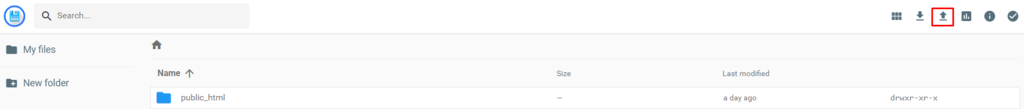 - Go to the directory where you want to store the file – in this example, we’ll use public_html. Click the Upload button in the upper-right corner.