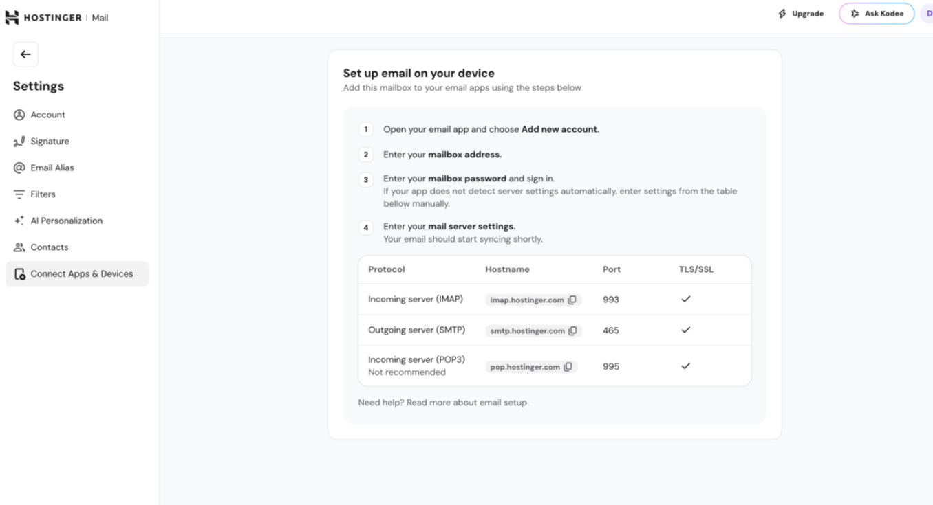You can find instructions on connecting to various email clients in Step 2 of the Set Up Your Email Client on hPanel screen. Under Recommended apps, you can learn how to set up Hostinger email on Apple Mail, Thunderbird, and Gmail.