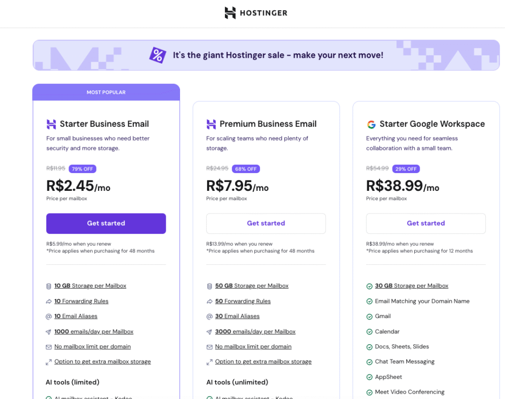 Hostinger offers various email services tailored to different needs, from free emails bundled with web hosting to advanced business email solutions and Google Workspace integration.