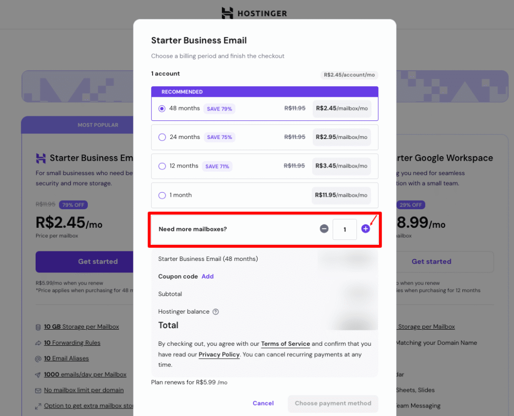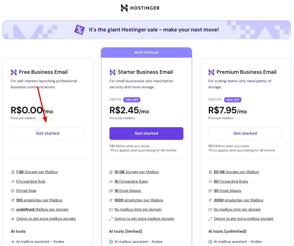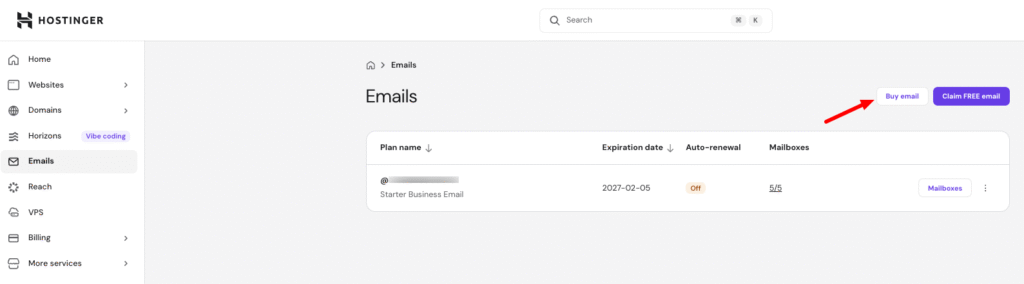 1. Select your email plan. If you choose “Buy Email” you will be prompted to pick between our top options at Hostinger: