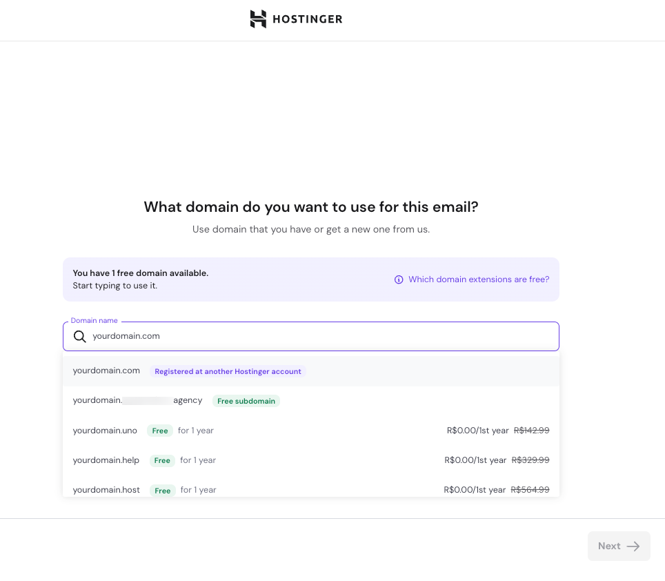 1. Start typing the domain for which you want to create an email account and select it from the dropdown or start a new registration. Then, select “Next”