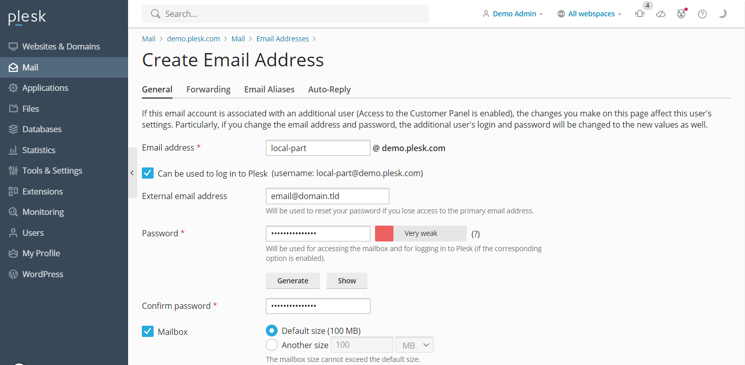 To create a new email account, click the Mail tab → Mail AccountsCreate Email Address to create. Enter your desired local part, set a new password, and click Ok to finish the process.