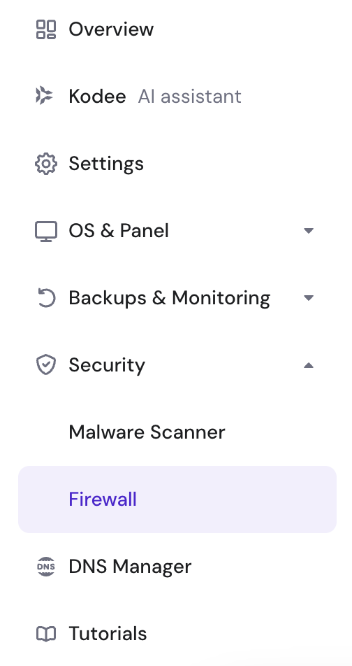 Alternatively, you can set up our integrated Hostinger VPS Firewall. Start by choosing your VPS and navigating to the Security → Firewall section:
