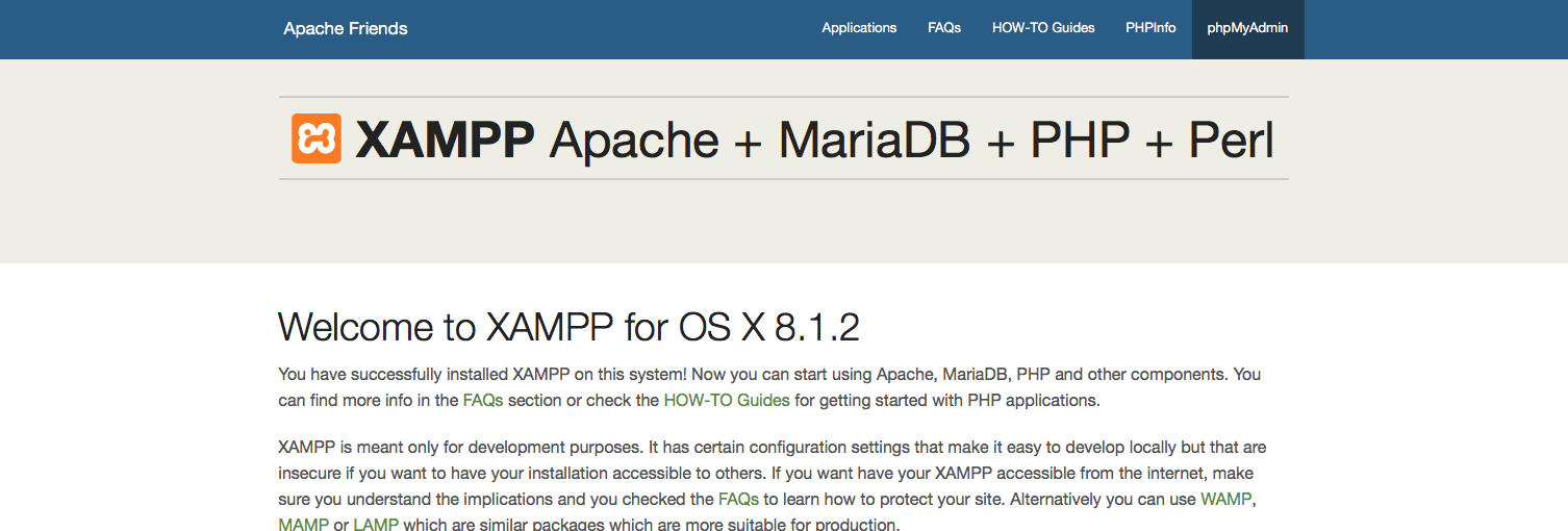 To check and see if your server is running, search your browser for http://localhost. This will open a XAMPP welcome page with applications, PHP information, and your phpMyAdmin.