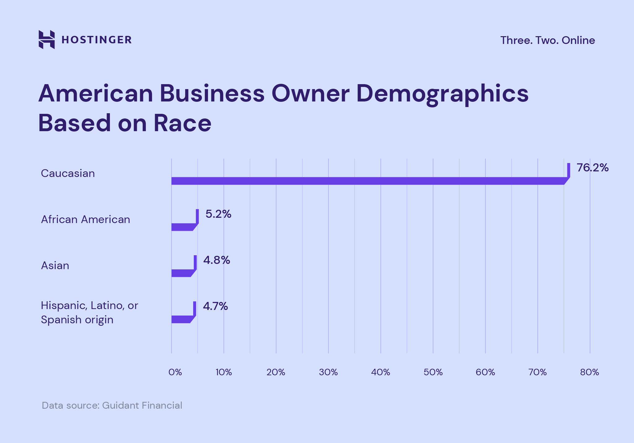 76.2% of US business owners are Caucasian, followed by African American (5.2%) and Asian (4.8%). Meanwhile, Hispanic-owned businesses make up 4.7% of the total number.