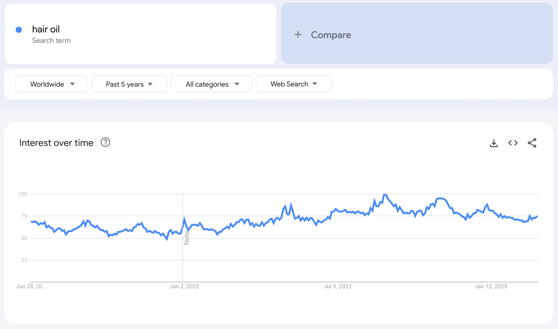 Google Trends shows that searches for “makeup” remain relatively steady year-round, with notable spikes during end-of-year sales events.
