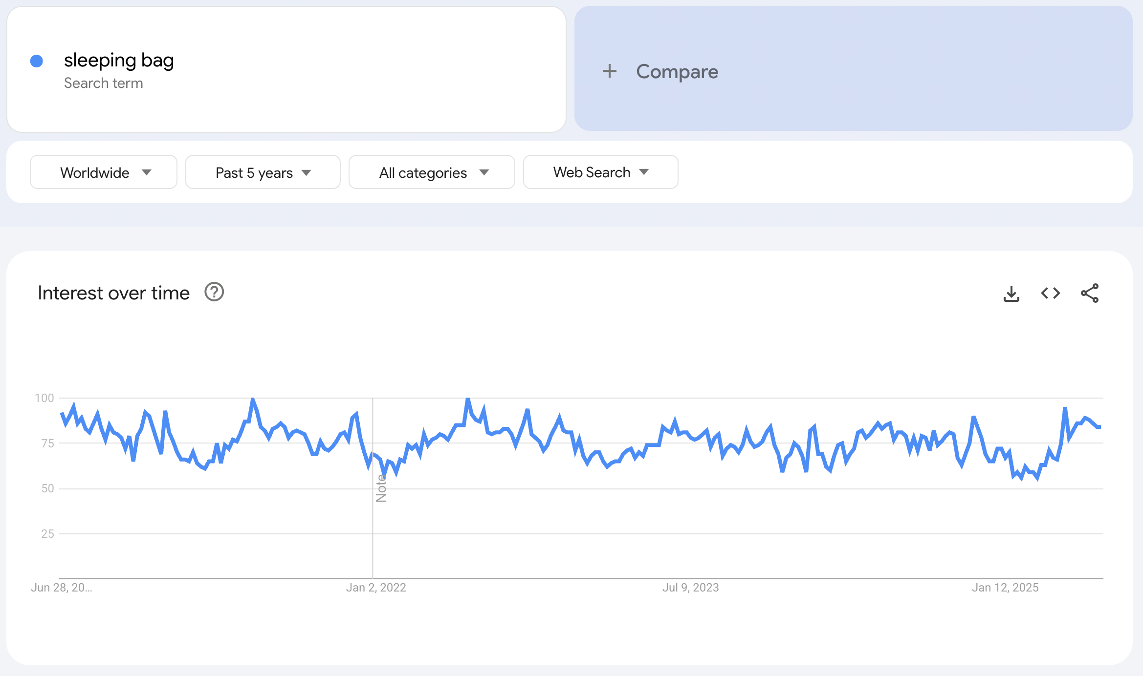 Google Trends shows that searches for sleeping bags follow predictable seasonal patterns, peaking in spring and early summer when people start planning their camping trips.