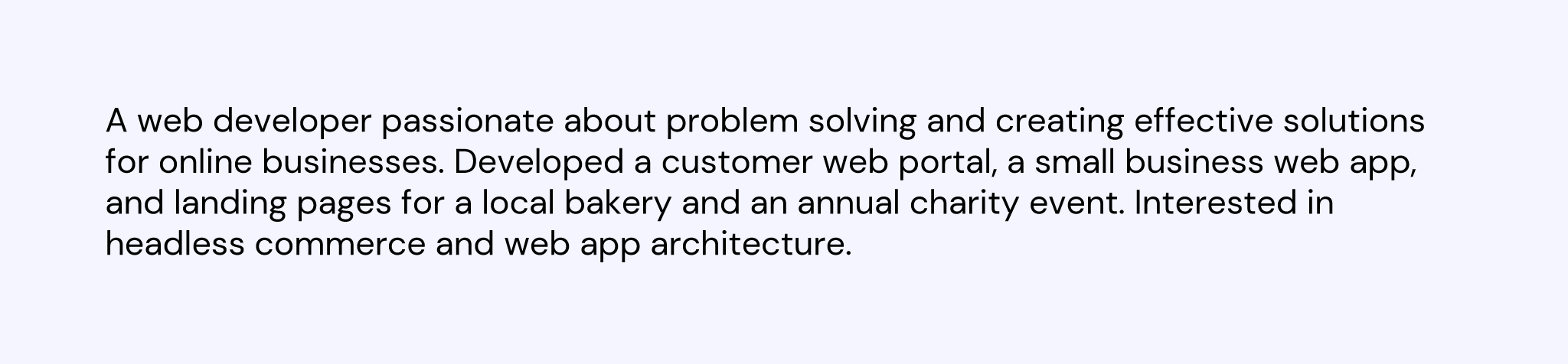 A solution-driven freelance full-stack web developer with 3 years of experience building web services for clients in the eCommerce industry. Developed responsive and accessible web applications across multiple APIs according to industry standards. I am looking for exciting web-based projects to extend my expertise as a professional full-stack web development enthusiast.