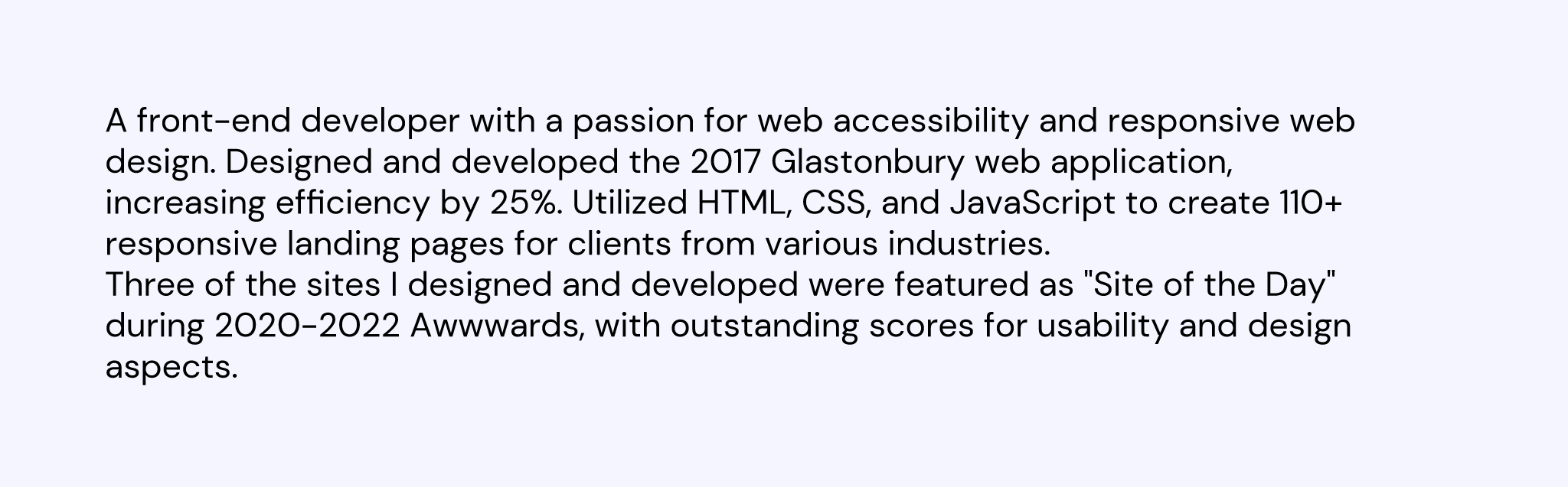 - Other relevant skills: Adobe Photoshop and Illustrator, WordPress, wireframes, debugging, DNS management, responsive web design, APIs, Agile and Scrum development process, performance testing, cross-browser compatibility, UX & UI
