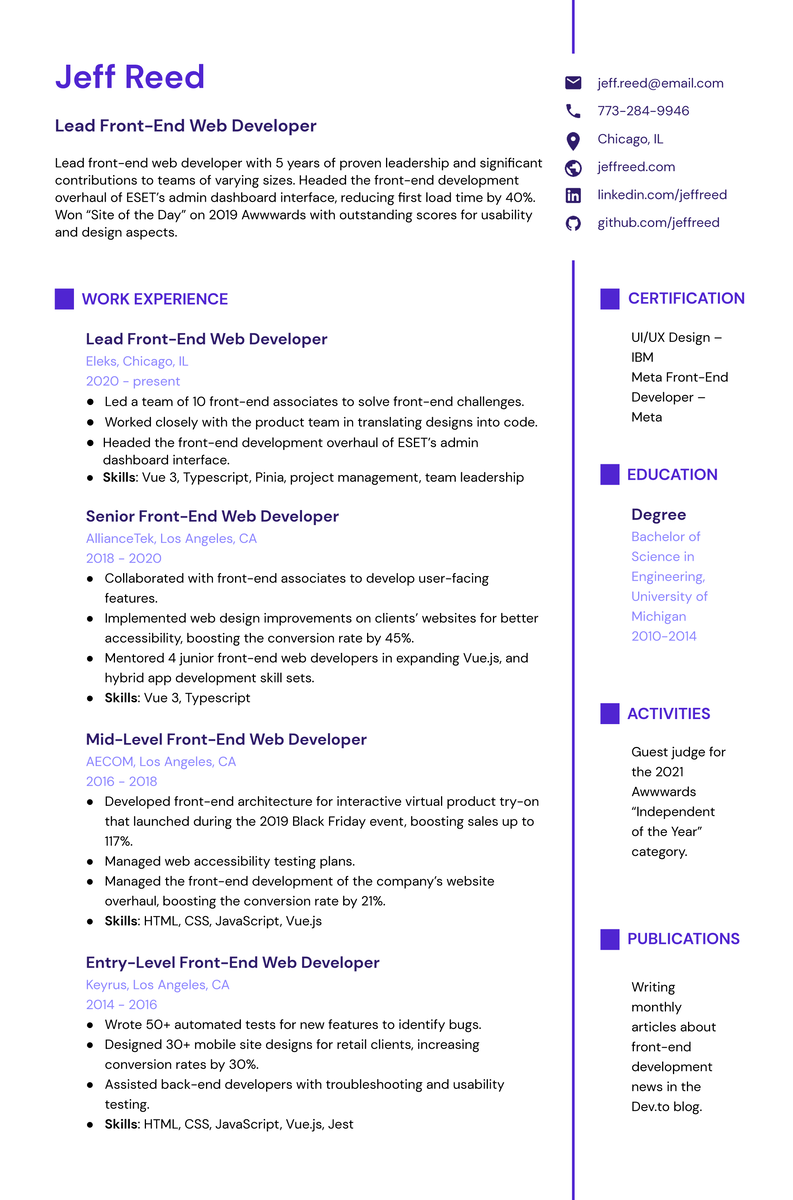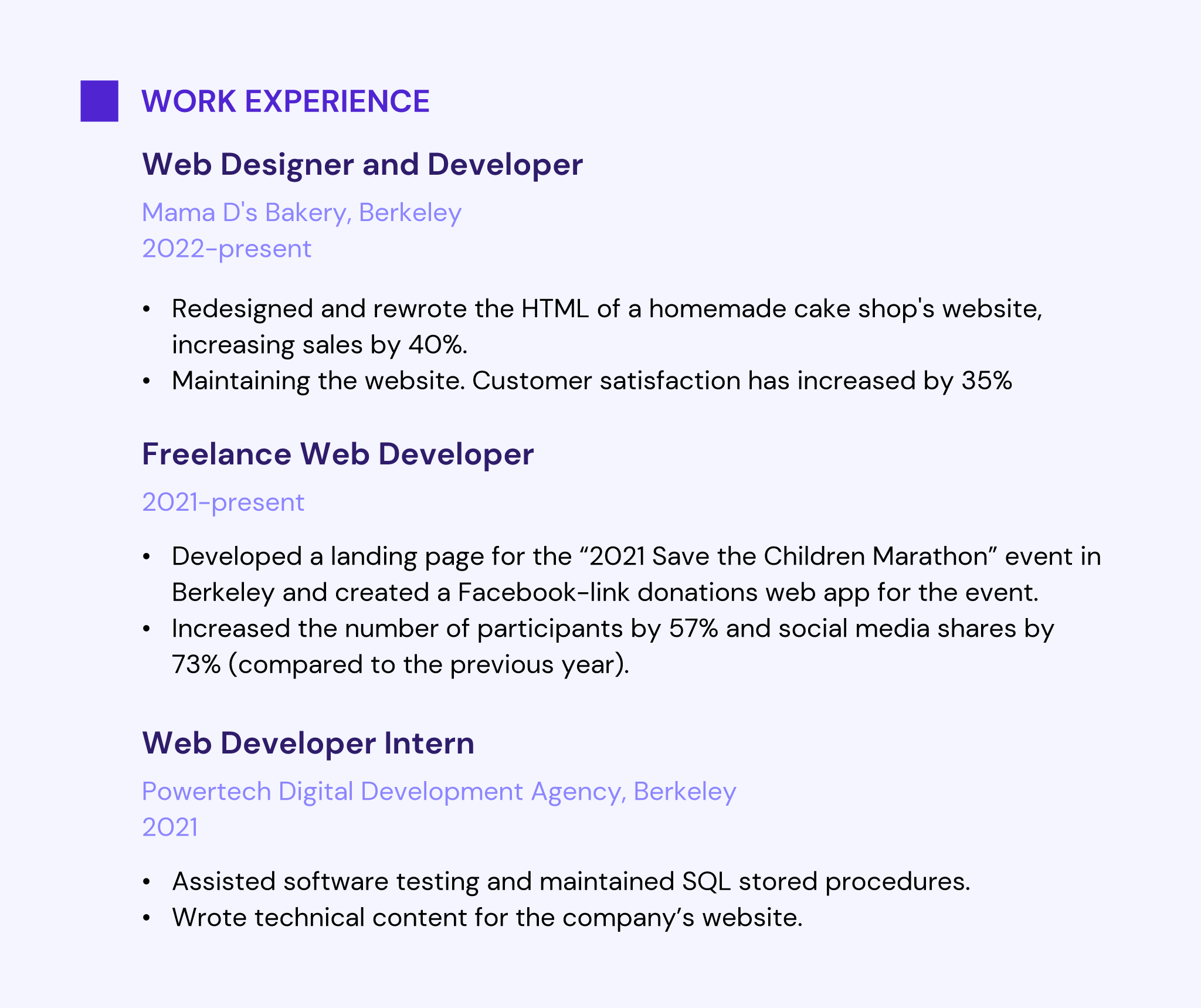 Unlike a senior developer, an entry-level candidate hasn’t been a web developer long enough to accumulate professional experience. In this case, consider creating your own web development project and elaborating on your education and coursework.