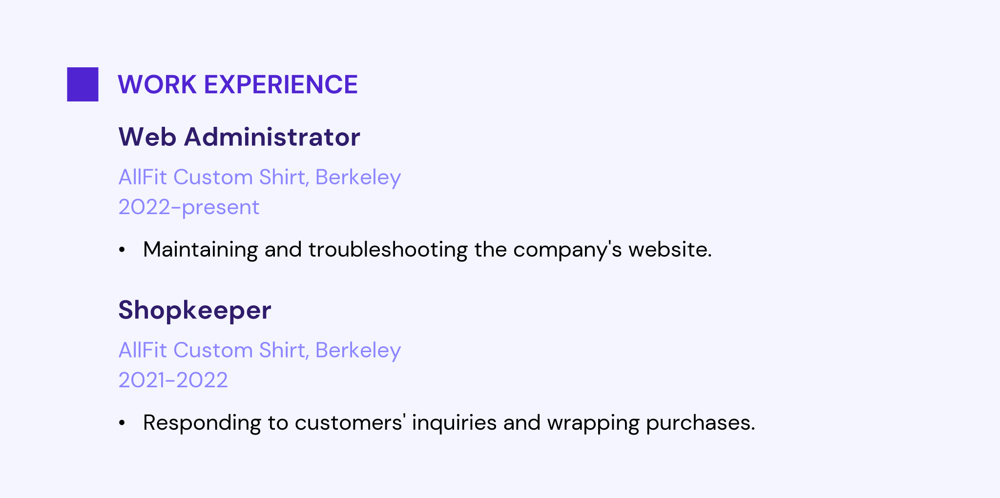 Your web developer resume should showcase work experience gained in the IT industry or emphasize your web development skills. Any other work experience that doesn’t meet either criterion, like being a shopkeeper, shouldn’t appear in your professional web developer resume template.